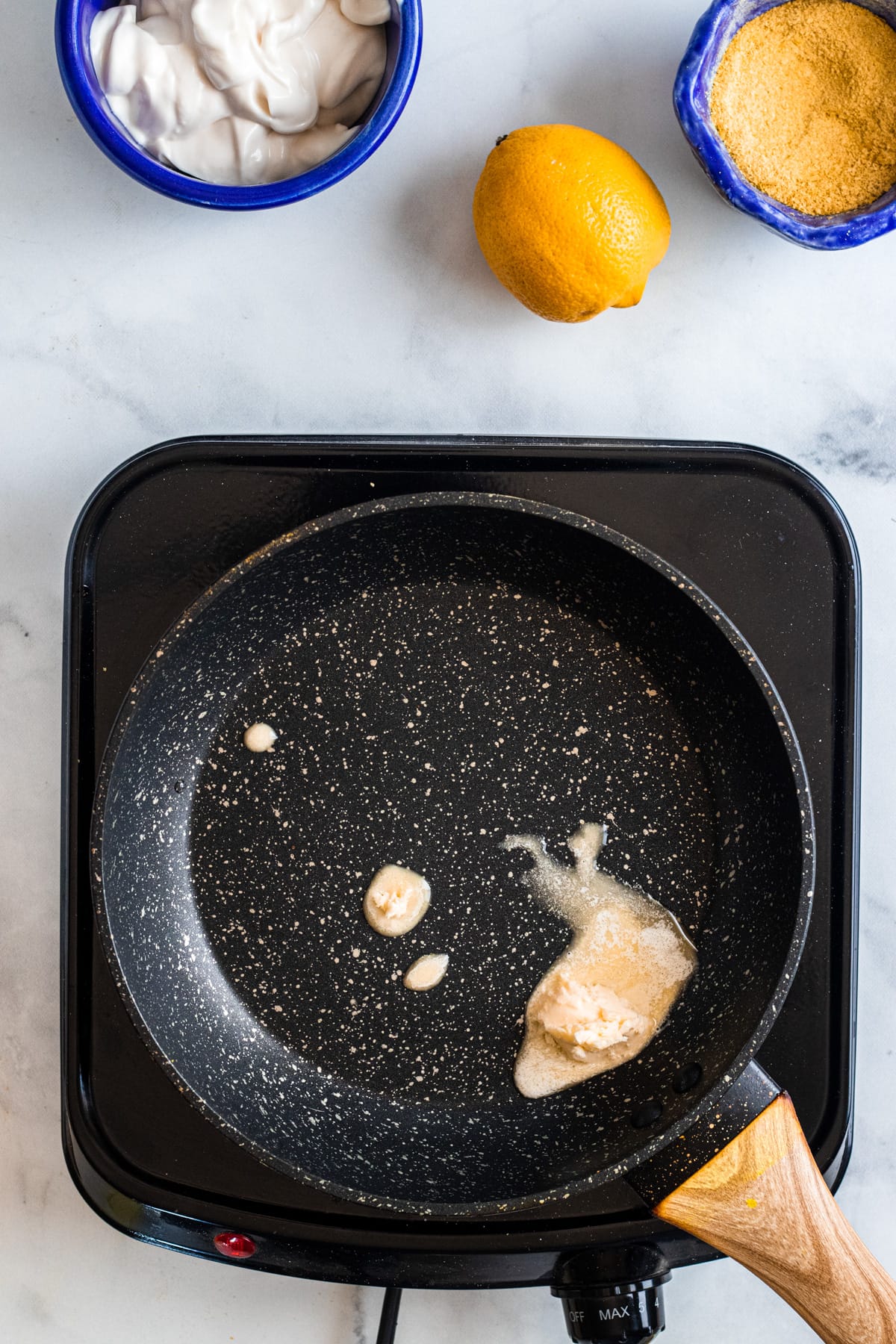 Step 1: melt vegan butter over low heat in a small skillet. Since we’re not using egg yolks, there’s no need for a double boiler.
