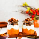 Add a layer of Pumpkin Pie Overnight Oats to the bottom of several small jars or glasses. If you prefer your overnight oats warm, now is the time to stick them in the microwave for about 25 seconds (more or less, depending upon the size of your container). Remove, then top with a layer of non-dairy vanilla yogurt and finalize with a layer of caramelized pecans. Serve immediately. Enjoy!